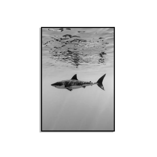 This stunning black and white poster features a majestic shark swimming gracefully under the water. Perfect for adding a modern, aquatic touch to any room. Ideal for marine life enthusiasts. Product contains a single poster only.