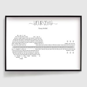 Our collection of personalised Song Lyrics Posters allows you to immortalize your favourite song lines in a stylish and unique way. Whether a timeless classic or a modern hit, these posters make a perfect keepsake or gift for music lovers. Add a personal touch to your home decor or give a thoughtful, custom gift with our high-quality, personalised text and quote posters.