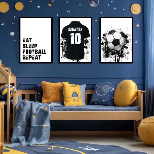 This personalised poster set features a dynamic football theme perfect for any sports enthusiast. Highlighting bold text with the phrase 'EAT SLEEP FOOTBALL REPEAT' and customisable elements, it adds a sporty flair to any room. The product is customisable, allowing for a unique touch to your décor. Product contains a set of 3 posters only.