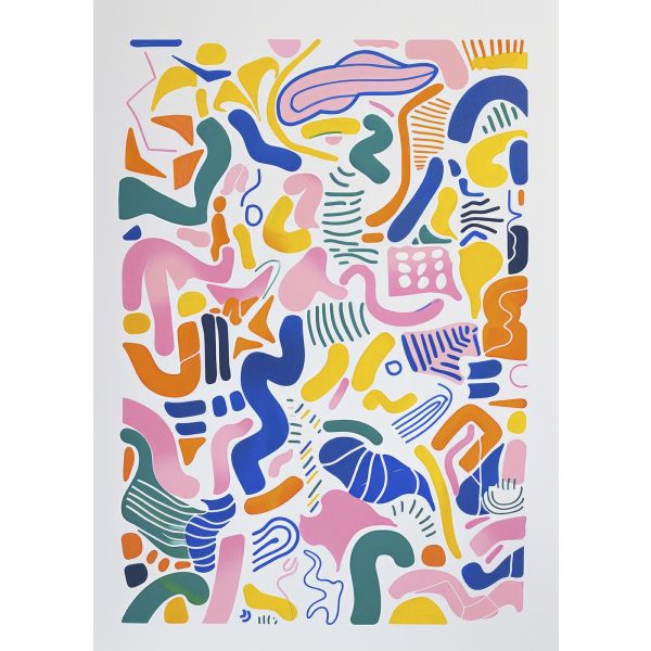 This vibrant wall poster features an abstract art design with a stunning mix of colors and shapes. Perfect for adding a touch of modern artistry to any room. Product contains a single poster only.