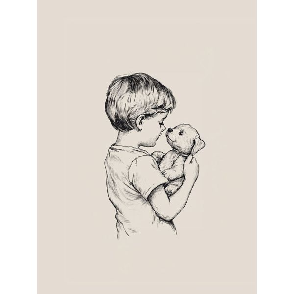 This charming poster depicts a young boy lovingly holding a teddy bear, capturing an intimate childhood moment. The delicate illustration is rendered with finely drawn lines on a simple background. Ideal for children's rooms or nurseries, this product contains a single poster only.