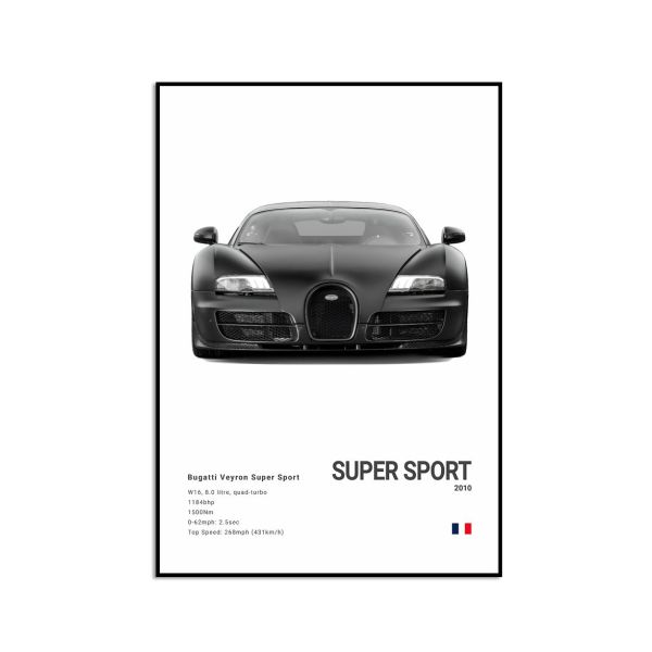 This poster features the iconic Bugatti Veyron Super Sport, showcasing its sleek design and impressive specifications. The text includes details such as W16, 8.0 litre, quad-turbo, 1184bhp, 1500Nm, 0-62mph: 2.5sec, Top Speed: 268mph (431km/h). Perfect for car enthusiasts or as a statement piece in any room, this product contains a single poster only.