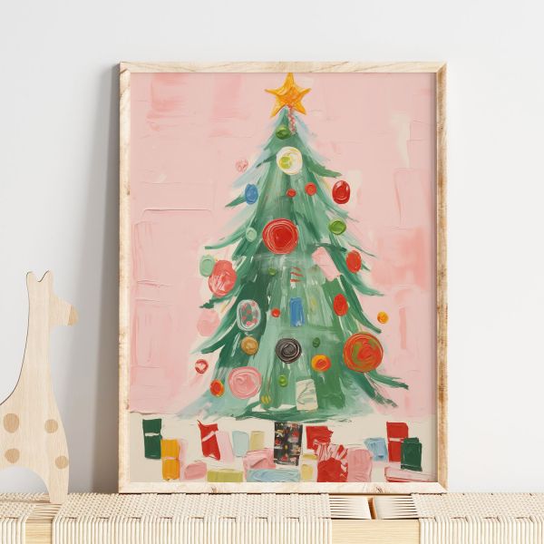 This poster features an artistic representation of a Christmas tree, adorned with colorful ornaments and presents. It brings warmth and festive charm to any space. Embrace the holiday spirit with this delightful piece. Product contains a single poster only.