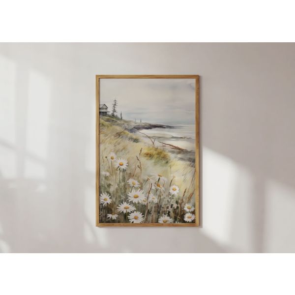This enchanting poster captures a serene coastal scene with delicate daisies in the foreground and a distant house by the sea. A perfect piece to bring a touch of nature and tranquility into your home decor. Product contains a single poster only.
