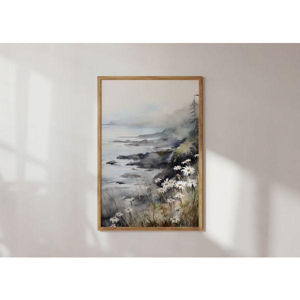 This beautiful poster captures the serene beauty of a coastal landscape with delicate daisies in the foreground. The misty atmosphere adds a touch of mystery and tranquility, perfect for any room. Product contains a single poster only.