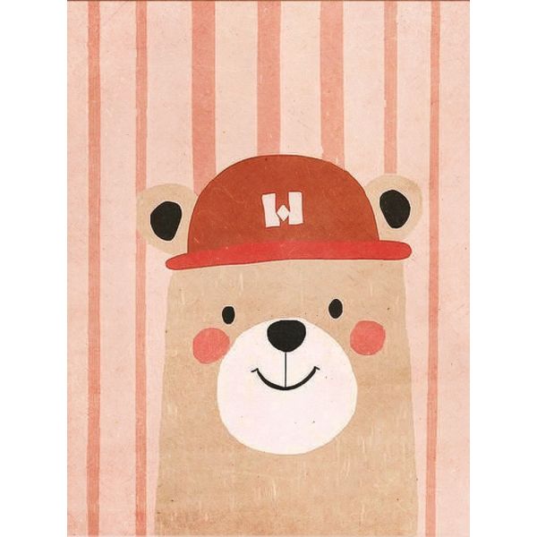 This charming poster features a cute bear wearing a red cap on a soft, striped background. Perfect for adding a delightful touch to any room. Product contains a single poster only.