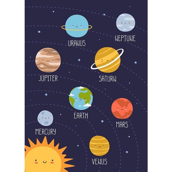 This adorable solar system poster features friendly planet illustrations including Uranus, Neptune, Jupiter, Saturn, Earth, Mars, Mercury, Venus, and the Sun. Perfect for children's rooms or educational settings, this poster brings a charming depiction of our solar system to life. Product contains a single poster only.