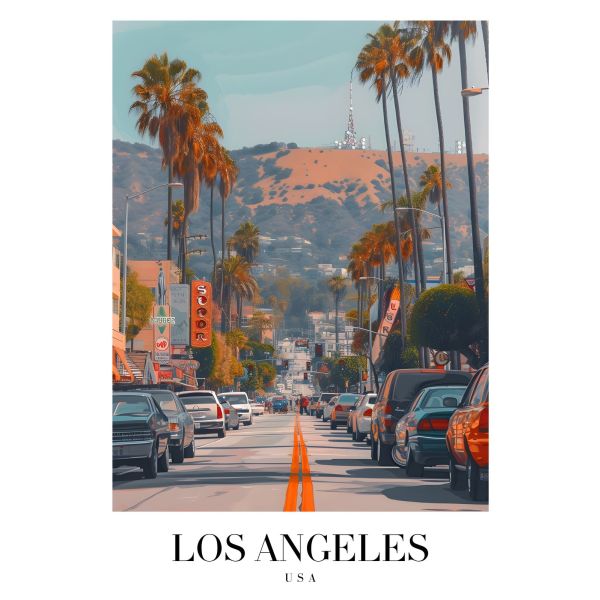 This wall poster beautifully captures the vibrant skyline of Los Angeles, USA. The bustling city streets, lined with iconic palm trees, evoke the dynamic essence of LA. Prominent text reads, 'LOS ANGELES USA.' The product contains a single poster only.