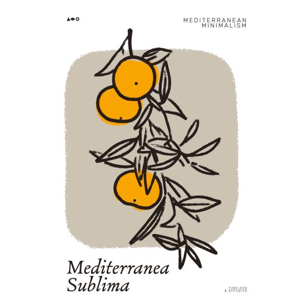 This poster captures the essence of Mediterranean simplicity with its bold oranges and soothing colors. The artwork, titled 'Mediterranea Sublima', includes phrases like 'Mediterranean Minimalism' and 'Timeless & Effusive'. Product contains a single poster only.