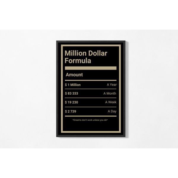 This poster features the 'Million Dollar Formula' outlining different amounts for time periods: $1 Million per year, $83,333 per month, $19,230 per week, and $2,739 per day. It includes the motivational quote, "Dreams don't work unless you do." A stylish and inspirational piece for any space. The product contains a single poster only.
