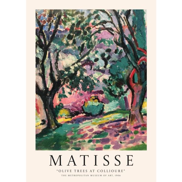 This poster showcases Henri Matisse's 'Olive Trees at Collioure', a vivid portrayal of nature with vibrant colors and expressive brushstrokes. Created in 1906, Matisse's work is housed at the Metropolitan Museum of Art. The product contains a single poster only.