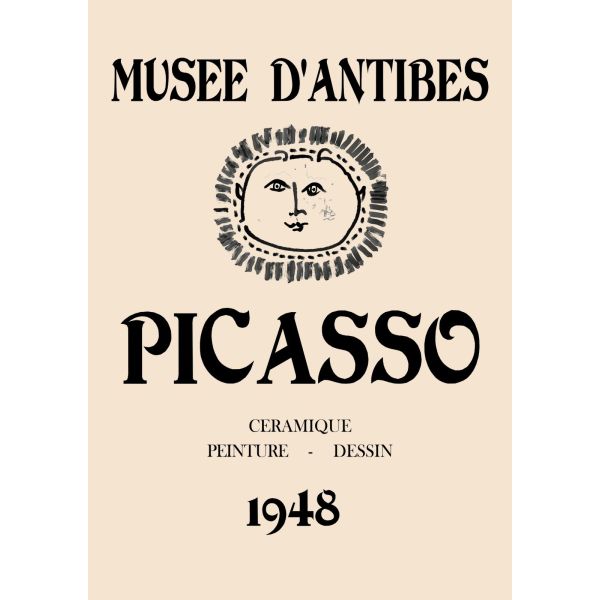 This poster features an exhibition poster by Picasso from the Musée d'Antibes, showcasing ceramic works from 1948. The text on the poster reads: 'Musée d'Antibes PICASSO CÉRAMIQUE PEINTURE - DESSIN 1948'. Product contains a single poster only.