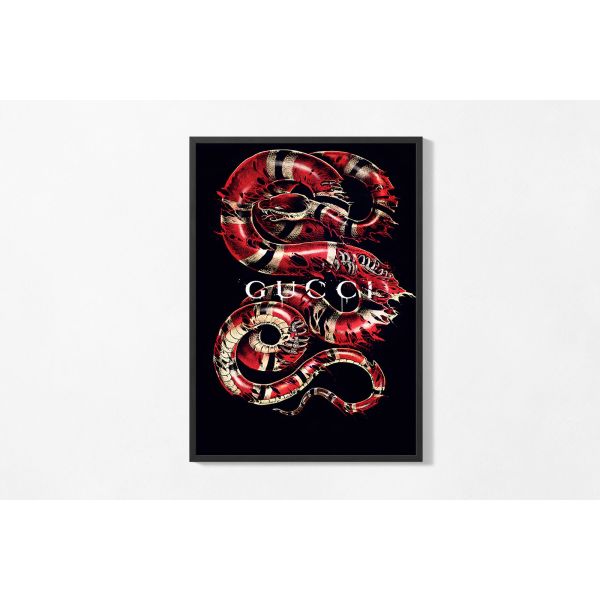 This striking poster features a vivid red snake illustration with intricate details, complete with the text 'GUCCI'. Ideal for adding a touch of bold design to any space. Product contains a single poster only.