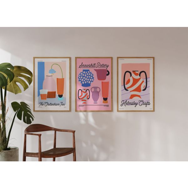 The 'Retro Pottery' poster set features vibrant illustrations with timeless appeal. Prominent text includes: 'Timeless Edition', 'Flora Moderna', 'Retro Artwork', 'Helmsley Crafts', 'The Cheltenham Inn', and 'Snowshill Pottery'. Perfect for adding a touch of retro artistry to any space, this product contains a set of 3 posters only.