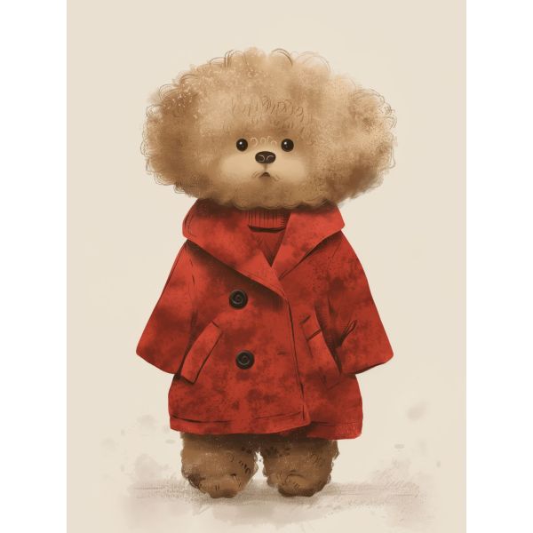 This charming poster depicts a fluffy teddy bear wearing a vibrant red coat. Perfect for adding a touch of warmth and playfulness to any room, it suits both children and adults alike. Product contains a single poster only.