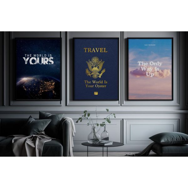 This striking set of posters captures the essence of exploration and ambition with the phrases 'The World is Yours', 'Travel: The World is Your Oyster', and 'The Only Way is Up'. Perfect for any modern living space, these posters inspire and motivate. Product contains a set of 3 posters only.