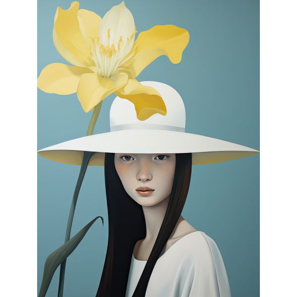 This stunning poster features a captivating portrait of a woman with a large yellow flower on her hat. The artwork emanates elegance and serenity, perfect for enhancing any living space. Product contains a single poster only.