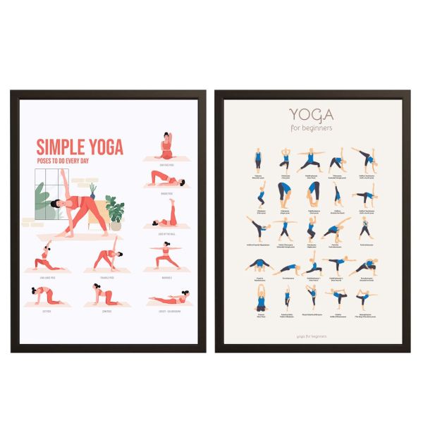 This yoga poster set showcases a variety of poses to practice daily and for beginners. Featuring simple and effective postures, these posters serve as a great visual guide. Prominent text includes: 'SIMPLE YOGA POSES TO DO EVERY DAY' and 'YOGA for beginners'. Product contains a set of 2 posters only.