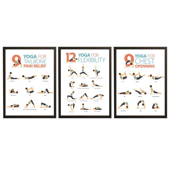Discover the benefits of yoga with these informative posters featuring poses for tailbone pain relief, flexibility, and chest opening. Illustrated with clear imagery and labeled positions, these posters are perfect for any yoga enthusiast. Prominent text includes: 'YOGA FOR TAILBONE PAIN RELIEF,' 'YOGA FOR FLEXIBILITY,' and 'YOGA FOR CHEST OPENNING.' Product contains a set of 3 posters only.
