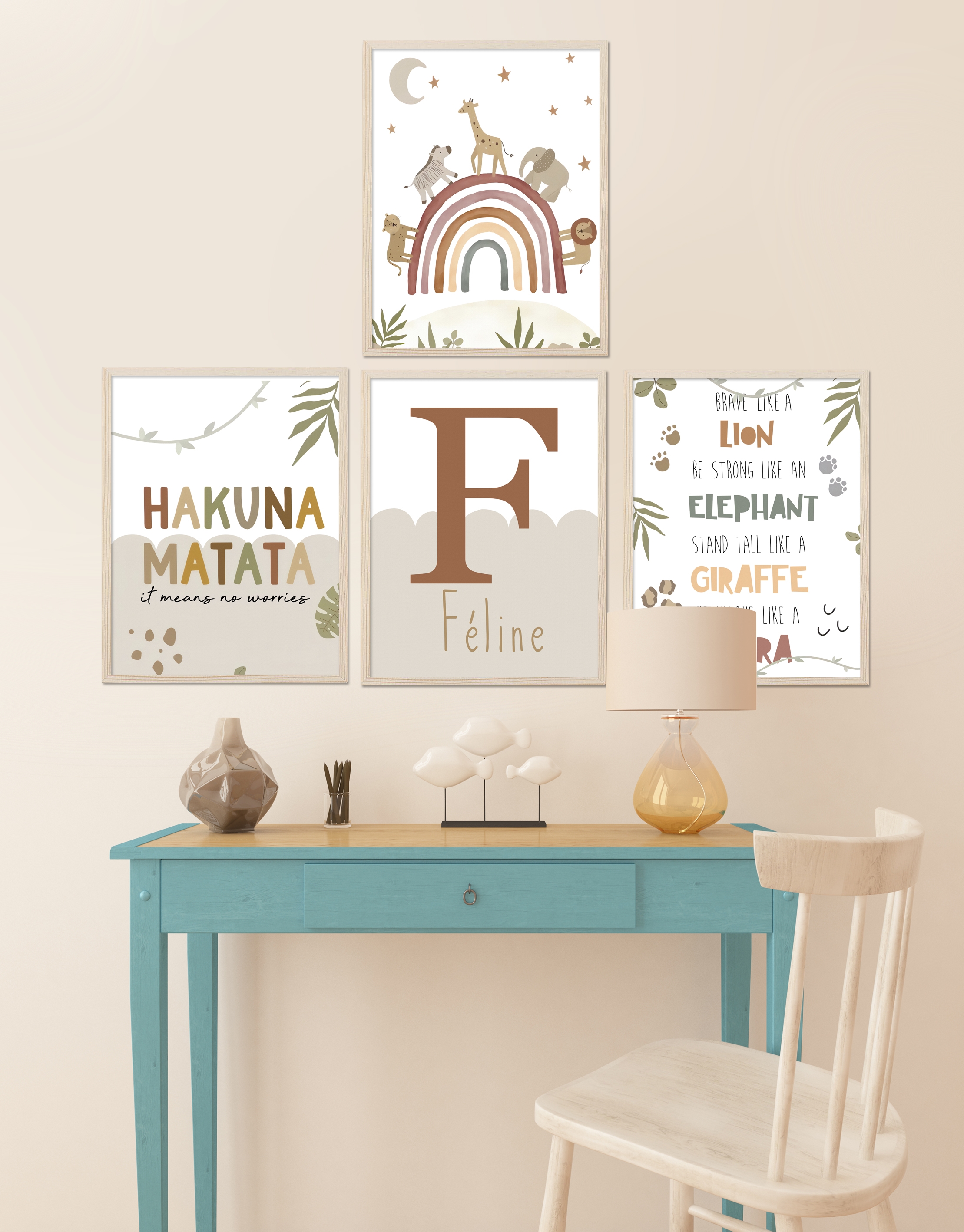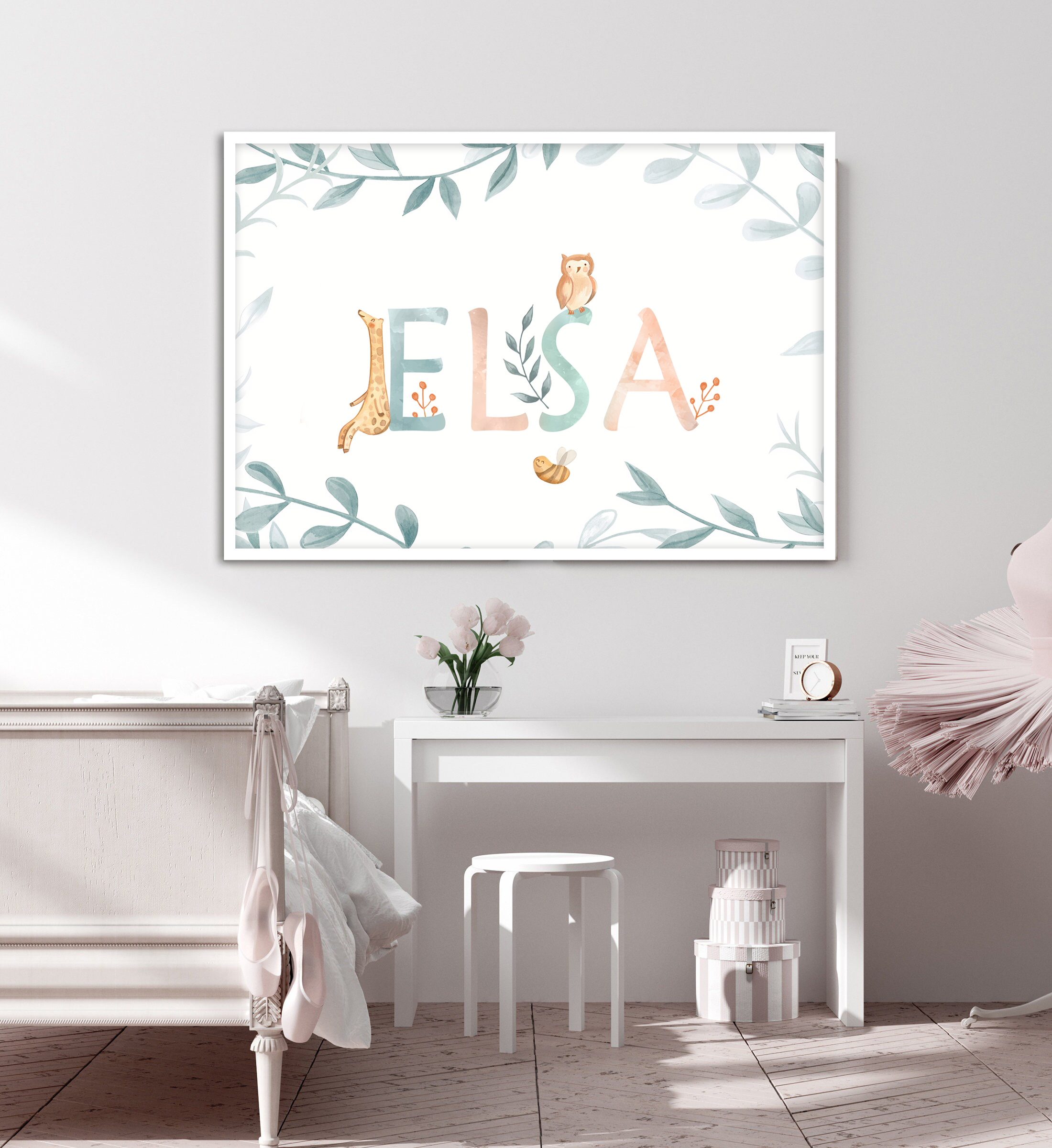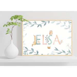 Our watercolor posters can be customized with names and are available in various motifs, from animals and flowers to excavators. These posters are sold individually and in sets of three, making them ideal for creating cohesive wall art. The soft, flowing colors create a harmonious and soothing atmosphere in any room, perfect for children's rooms or cozy corners at home.