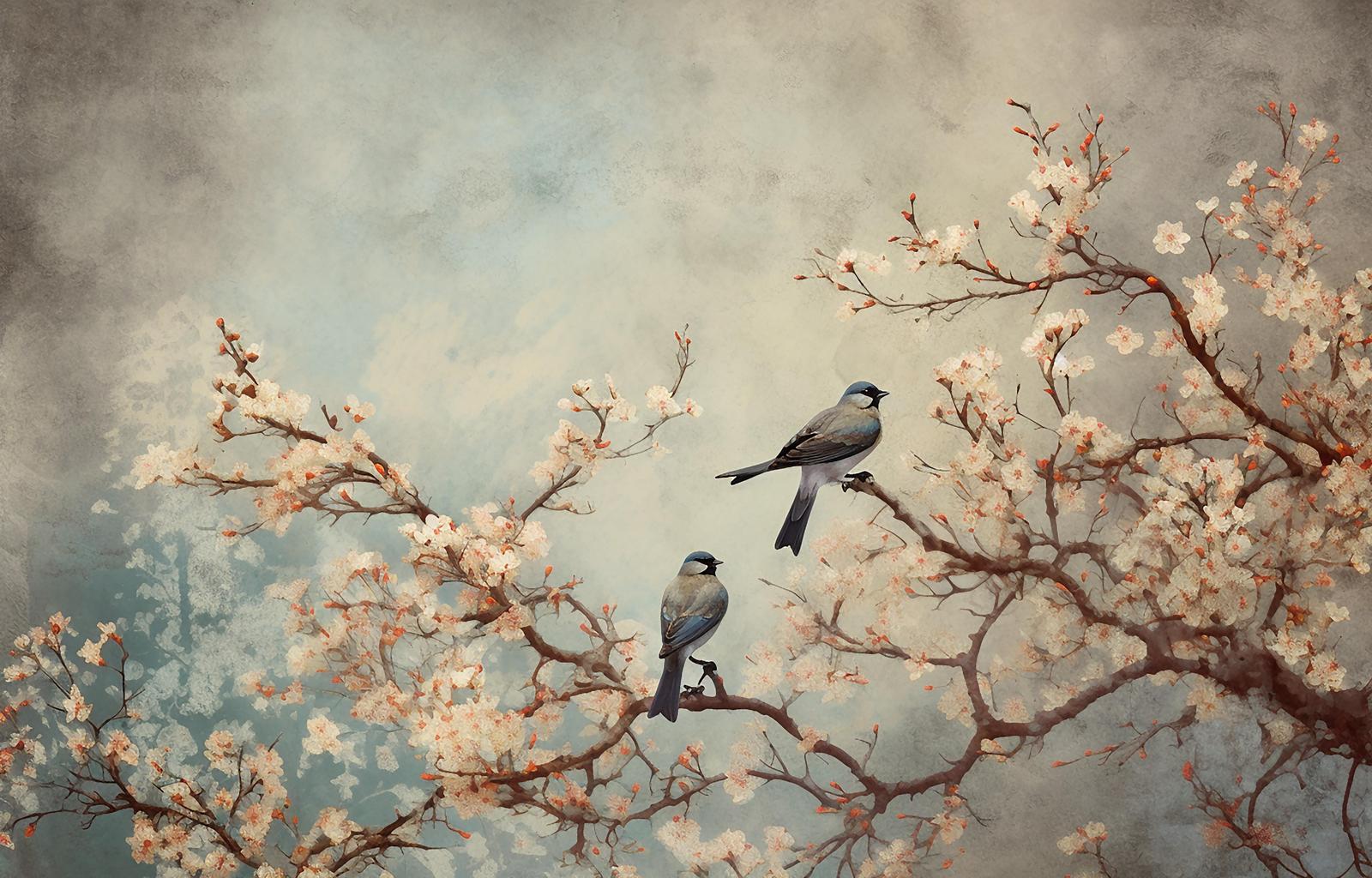 This beautiful wall paper features a serene scene of cherry blossoms with two birds perched on the branches. Perfect for adding a touch of nature and tranquility to your space. The subtle colors and realistic details bring the outside in for a refreshing ambiance. Ideal for any room with a nature-inspired theme.