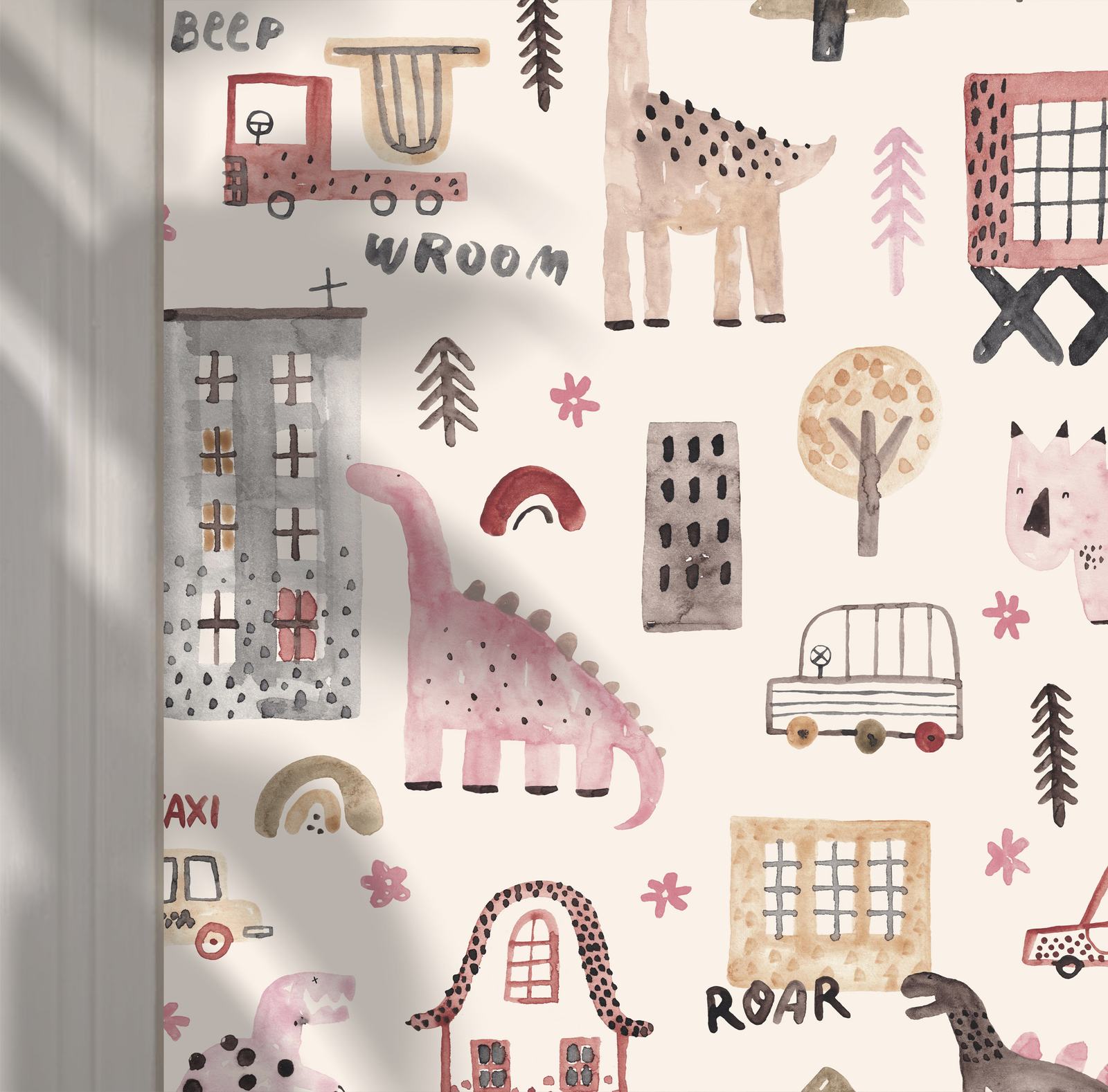 Explore a playful world with this dinosaur-themed wall paper, featuring adorable creatures and whimsical elements. Perfect for adding charm to a child's room, this design includes fun text like 'ROAR' and 'BEEP'. This product contains a single wall paper only.