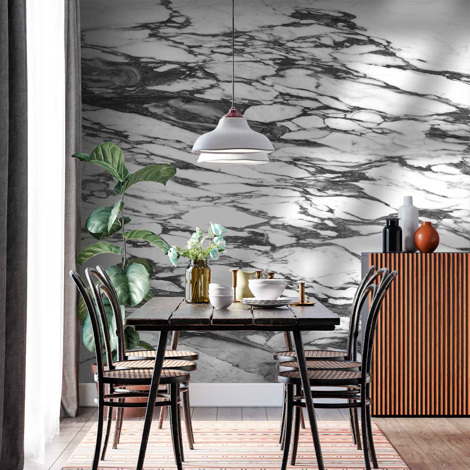 This stunning wall paper features a realistic marble effect, bringing a touch of elegance to any room. The black and white pattern adds a modern and sophisticated look to your decor. Perfect for living rooms, dining areas, or bedrooms. Enhance your space with the luxurious feel of marble.