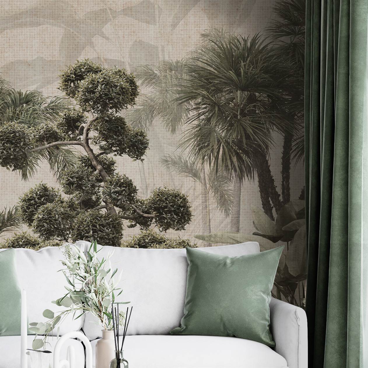 This exquisite wall paper presents a serene tropical paradise with lush greenery. Transform your living space with the calming vibes of palm trees and vibrant foliage, perfect for creating a tranquil environment.