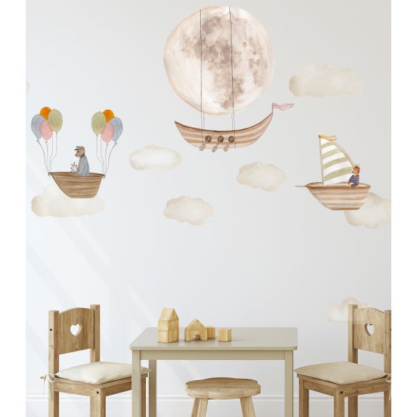 Nice set, originally painted in watercolour. the clouds of the sky make different boats with different fairy-tale characters, Captain and seafarers Tiger steer their boats along the horizon of the sky, but who is keeping the row still with the moon?